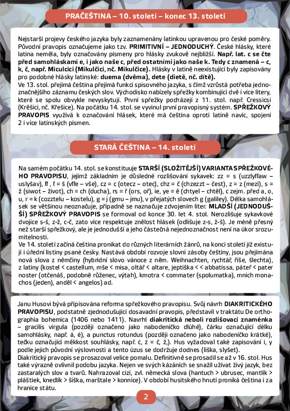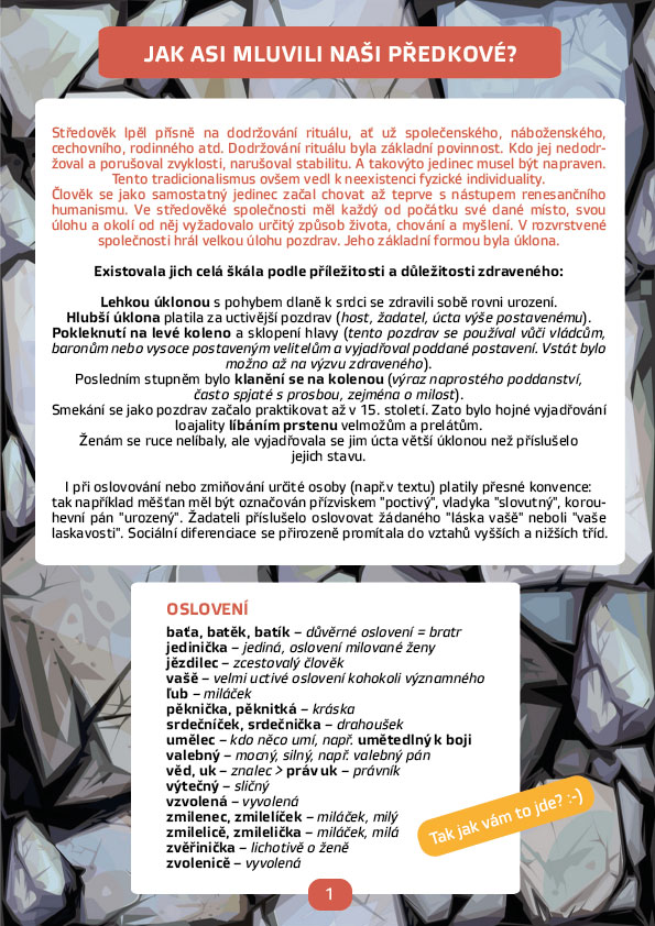 Historie je plná různých slov, která se nám mohou zdát až nesmyslná, například víte, co znamená věta: „Hlásní pozední říkal, že Jan Žižka má barbar až na jahódce?“ Zajímá vás, co nás vedlo k tomu přestat tyto výrazy používat? Pojďme se společně naučit několik středověkých slov, která možná používali i husitští bojovníci. Ti starší se mohou přiučit tomu, jak složitou cestu čeština musela ujít, než se ustálila do podoby, jakou známe dnes. A že to byla cesta! Věděli jste, že nejstarší předpísemné období datujeme už do 10. století? V příloze naleznete nejen slovník, ale také historická fakta a zajímavosti.