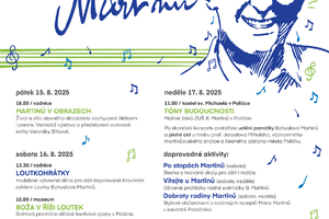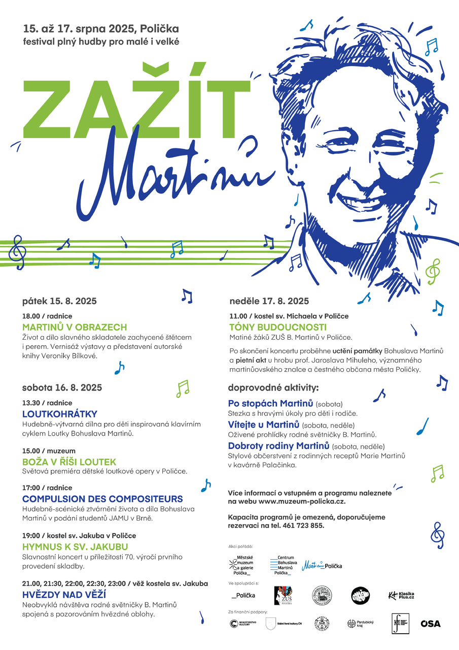 Festival Zažít Martinů 2025 vás provede světem slavného skladatele hravě i s hlubokým uměleckým zážitkem – nejenom hudebním. „Celá akce bude v 18 hodin zahájena vernisáží obrazů mladé talentované výtvarnice Veroniky Bílkové, která připravuje autorskou knihu o Bohuslavu Martinů. Ilustrace z této publikace budou v originálech vystaveny poprvé právě v Poličce. Jsou to velká plátna tvořená technikou olejomalby a malbou akrylem na plátno, takže výstava bude vskutku reprezentativní“, představuje první z akcí ředitelka muzea Pavla Juklová. Výstava se koná ve 2. podlaží barokní radnice na náměstí.